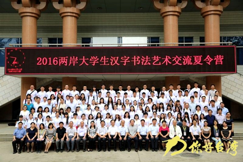 2016兩岸大學生漢字書法藝術交流夏令營同日開營。兩岸合編中華語文工具書大陸代總召集人彭興頎,臺灣總召集人、中華文化總會秘書長楊渡為兩岸營員授營旗。今年的夏令營活動是繼2014、2015年分別在浙江紹興文理學院和臺灣藝術大學成功舉辦后,由國家語委牽頭的兩岸合編中華語文工具書大陸編委會和臺灣中華文化總會繼續(xù)聯(lián)合主辦,由陜西省語委辦接力承辦、西安理工大學和陜西師范大學兩所高校協(xié)辦的。來自陜西和臺灣高校的十多所高校100名大學生將在為期8天的時間里,參加漢字書法藝術講座、書法教學、書法創(chuàng)作展示、觀摩碑林等活動,通過“體驗式交流”,了解兩岸語言文字使用和交流現(xiàn)狀,體驗兩岸語言文字與文化的“同根同源”“和而不同”,增進理解信任,共同珍惜、尊重和傳承中華優(yōu)秀語言文化,增加對中華文化的熱愛和認同。