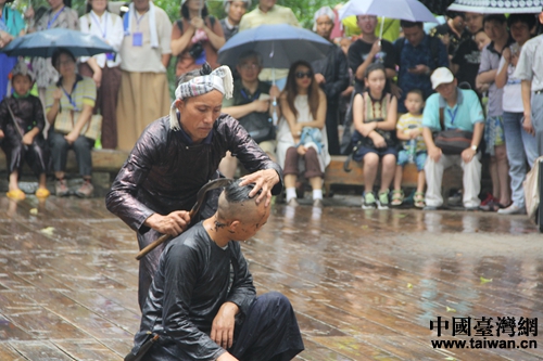 岜沙人的絕技鐮刀剃頭(中國(guó)臺(tái)灣網(wǎng) 蕪?fù)?攝)