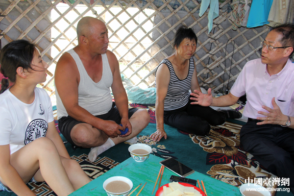 滕鴻年來到達(dá)日丹(左一)家蒙古包,與其父母話家常。(中國臺灣網(wǎng) 王思羽 攝)