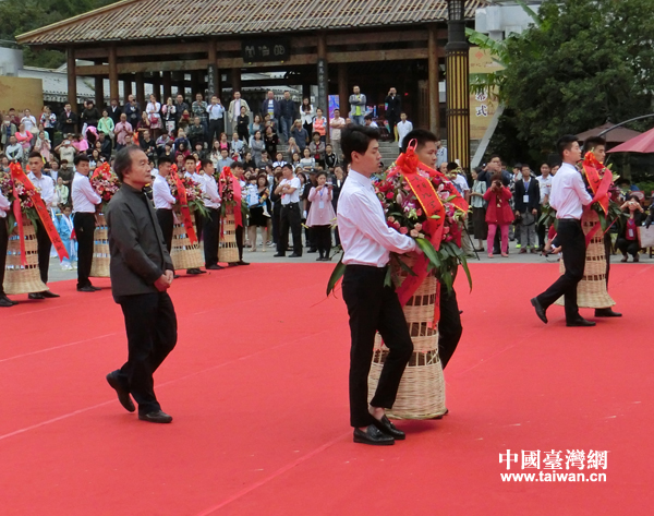 臺(tái)灣“中華文化總會(huì)秘書(shū)長(zhǎng)”楊渡獻(xiàn)花籃(中國(guó)臺(tái)灣網(wǎng) 王文英 攝)