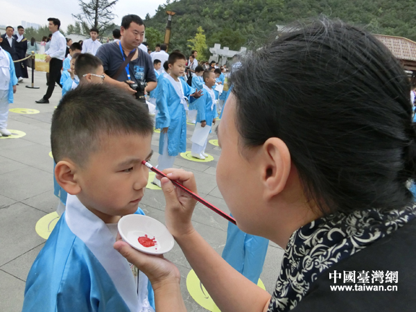 給小學(xué)生點(diǎn)朱砂(中國(guó)臺(tái)灣網(wǎng) 王文英 攝)