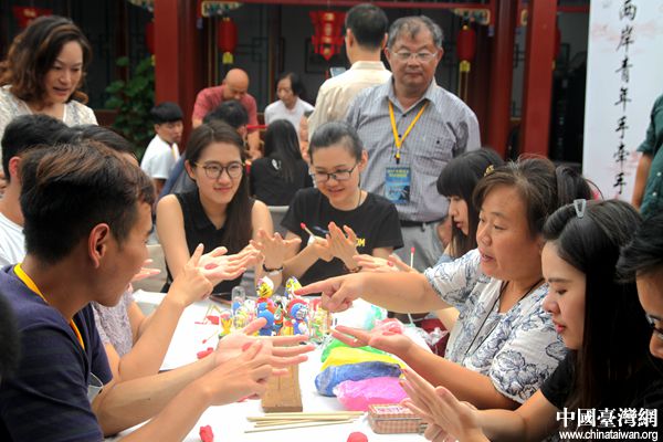 “中華兒女科技體驗(yàn)營”參訪北京市,與非物質(zhì)文化遺產(chǎn)傳承人一起捏面人。(中國臺灣網(wǎng) 李杰 攝)