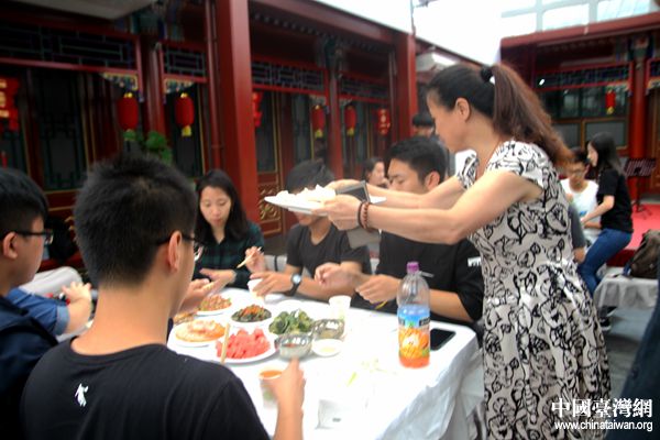 好客的北京社區(qū)居民包了四種餡的餃子歡迎客人,請來了剪紙、糖人、面人、京劇臉譜等非物質(zhì)文化遺產(chǎn)傳承人與兩岸青年互動體驗(yàn),一同制作具有北京特色的紀(jì)念品,并和兩岸青年一起聯(lián)歡表演文藝節(jié)目,最后,臺灣大學(xué)生幾人一組,到社區(qū)居民家中做客,了解胡同文化,進(jìn)行互動交流。