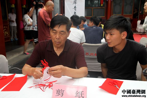 臺灣大學(xué)生向非物質(zhì)文化遺產(chǎn)傳承人學(xué)習(xí)剪紙。(中國臺灣網(wǎng) 李杰 攝)