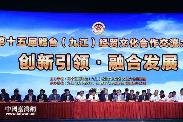 中國(guó)臺(tái)灣網(wǎng)8月30日九江訊(記者 雍紫薇) 今天上午,第十五屆贛臺(tái)(九江)經(jīng)貿(mào)文化合作交流大會(huì)(簡(jiǎn)稱(chēng)贛臺(tái)會(huì))在江西九江開(kāi)幕。中共中央臺(tái)辦、國(guó)務(wù)院臺(tái)辦主任張志軍,江西省省長(zhǎng)劉奇,臺(tái)灣三三企業(yè)交流會(huì)會(huì)長(zhǎng)江丙坤,全國(guó)臺(tái)企聯(lián)會(huì)長(zhǎng)王屏生等出席了大會(huì),本屆“贛臺(tái)會(huì)”參會(huì)人數(shù)約800人左右,其中臺(tái)灣嘉賓約500人,F(xiàn)場(chǎng)共簽約79個(gè)臺(tái)資入贛項(xiàng)目,簽約合同金額達(dá)40.6億美元。