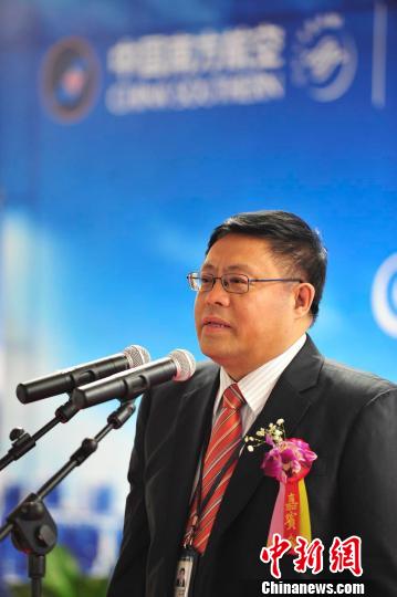 圖為中國南方航空公司海南分公司總經(jīng)理劉國軍在儀式上致辭!●樤骑w 攝