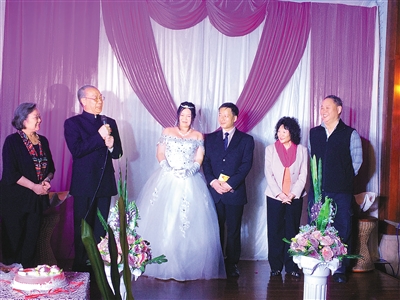 12月27日,在兩岸詩人黑俠和龍青的婚禮上。著名播音藝術(shù)家方明(左二)、著名海洋詩人汪啟疆(右一)分別攜夫人擔(dān)任證婚人。本報記者 蔡倩 攝