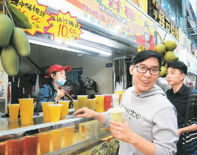 來自海峽兩岸的媒體記者12月18日起在海南省展開“一帶一路”、瓊臺(tái)合作專題采訪。記者18日在臺(tái)商經(jīng)營的?谔埑黔偱_(tái)小吃街采訪在此創(chuàng)業(yè)的臺(tái)灣青年。家在臺(tái)北的廖信翰留學(xué)畢業(yè)后落戶海口,用臺(tái)灣夜市的模式將自己的4個(gè)攤檔經(jīng)營得生意紅火。圖為廖信翰正在招呼客人。