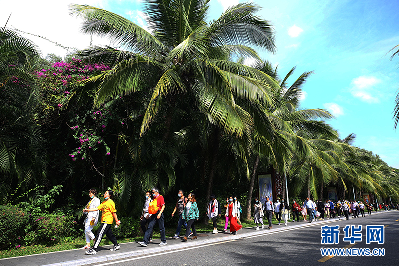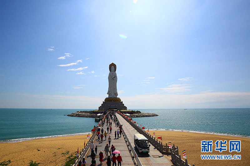 近日,全國(guó)大部地區(qū)氣溫驟降,不少游客選擇來(lái)到海南三亞旅游度假。1月10日,三亞迎來(lái)晴朗天氣,在三亞南山文化旅游區(qū),人們?cè)诙张?yáng)中感受迷人的熱帶濱海風(fēng)光和人文魅力。圖為1月10日,游客在三亞南山文化旅游區(qū)游覽。新華網(wǎng)發(fā)(陳文武 攝)