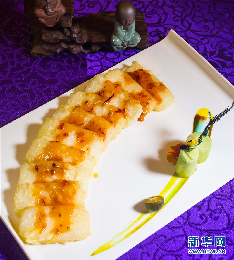 近日,三亞南山新推出用冬瓜制作的名為“泰汁鱈魚片”素菜。新華網(wǎng)發(fā)(陳文武攝)