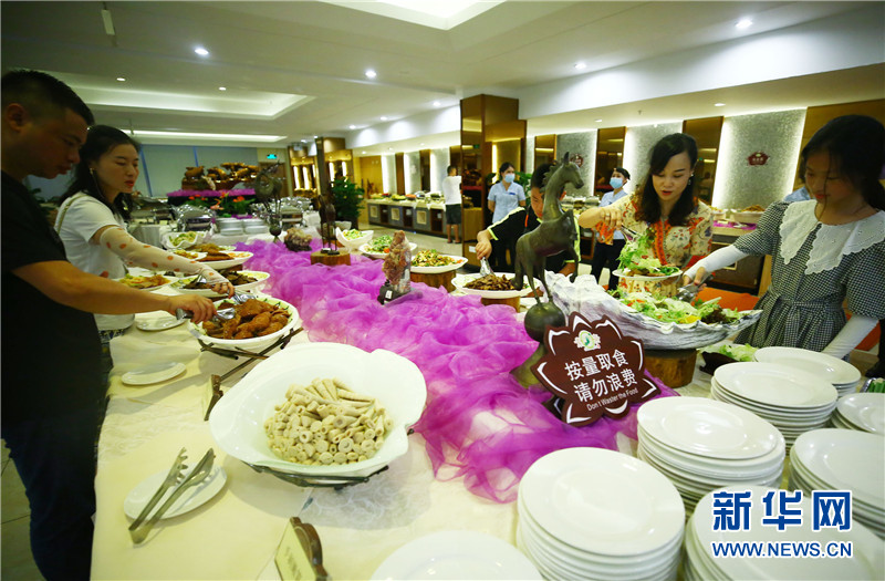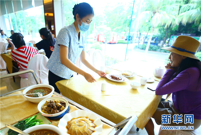 8月12日,游客在三亞南山文化旅游區(qū)緣起樓素齋自助餐廳取餐。新華網(wǎng)發(fā)(陳文武攝)