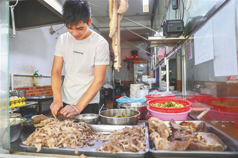 “我們已經(jīng)在這里做了40多年了,算是干了一輩子了!毙〉甑牟AЧ褡永,展示著還冒著熱氣的白斬雞——黃澄澄的雞皮色澤油亮,勾人食欲。店主蘭姨笑容滿面,時(shí)常和食客閑聊幾句。