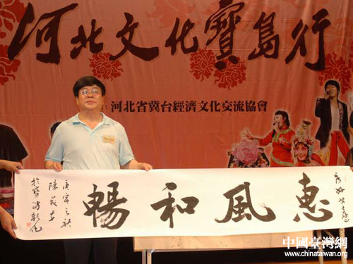 河北省書協(xié)副主席陳茂才的書法表演也受到了觀眾的歡迎,尤其是有幸得到他墨寶的觀眾更是喜不自勝。來自彰化的許秀女得到了陳茂才的“惠風(fēng)和暢”書法,非常高興地表示回去后一定裝裱起來,好好收藏。在現(xiàn)場(chǎng),演出小分隊(duì)還向觀眾贈(zèng)送了武強(qiáng)年畫、蘆葦畫等。