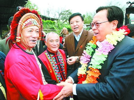 上午11時許,率團參加“中原文化寶島行”活動的中共中央委員、河南省委原書記、省人大常委會主任徐光春一行經過三個多小時的長途跋涉,來到了大山深處的特富野社區(qū)。一下車,美麗的阿里山姑娘們就跑上前去,將精心制作的花環(huán)掛在貴賓們胸前。身著鮮艷的民族傳統(tǒng)服裝的村民們用最熱烈的掌聲和歡呼聲歡迎遠方的客人。村口鳴放起只有重大節(jié)日才登場的禮炮,“歡迎你們!歡迎親人們回家!”真誠的問候此起彼伏,大家都是第一次見面,都是剛剛相識,卻像多年不見的家人一樣熱情地握手、緊緊地擁抱。