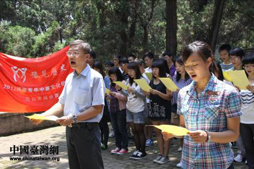 中國臺灣網(wǎng)7月12日平頂山消息 “大江東去,浪淘盡,千古風(fēng)流人物,故壘西邊,人道是,三國周郎赤壁,……”這不是教室學(xué)生們的讀書聲音,它是兩岸青年學(xué)子在“三蘇墳”前齊誦蘇東坡著名的《念奴嬌·赤壁懷古》。7月11日,2012年“豫見歷史——兩岸青年中原文化研習(xí)營社會實(shí)踐分營”一行走進(jìn)平頂山郟縣三蘇園,在這里舉行了一場別具風(fēng)格的兩岸青年文化交流活動。