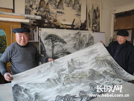 彭玉奇(左一)展示其創(chuàng)作的夢境中國山水風光國畫作品杜慶君攝