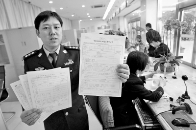 民警向記者展示以前辦理三類(lèi)證件所需填寫(xiě)的三張表格(右手所拿)和今后需填寫(xiě)的表格(左手所拿)