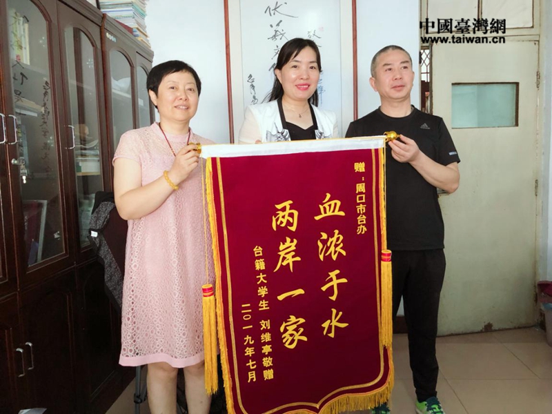 中國臺(tái)灣網(wǎng)7月16日訊 7月11日,周口市臺(tái)辦收到當(dāng)?shù)厝罕娡跞f里夫婦專程送來的印有“兩岸一家,血濃于水”的錦旗。王萬里夫婦激動(dòng)地說,“沒有想到周口市臺(tái)辦這么短時(shí)間能幫兒媳臺(tái)胞劉維亭解決就業(yè)問題,讓劉維亭感到黨和政府的溫暖,我們一定不辜負(fù)周口市臺(tái)辦為劉維亭爭(zhēng)取的就業(yè)機(jī)遇,讓劉維亭勤奮工作,在周實(shí)現(xiàn)人生價(jià)值,打拼圓夢(mèng)!