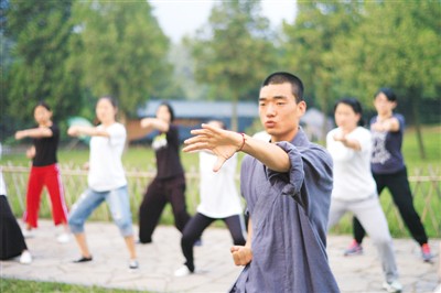 兩岸學(xué)生在少林寺師父帶領(lǐng)下練習(xí)八段錦。(楊程晨 攝)