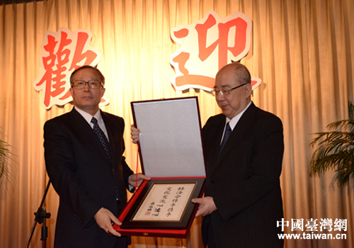 5月28日,在圓山飯店與吳伯雄先生互贈(zèng)禮品。(圖片來源:湖北省臺(tái)辦)