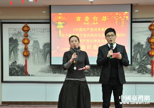 中國(guó)臺(tái)灣網(wǎng)1月25日武漢訊 新年伊始,氣象更新,在喜迎新春佳節(jié)的日子里,為深入學(xué)習(xí)貫徹黨的十八屆六中全會(huì)精神,推進(jìn)機(jī)關(guān)精神文明建設(shè)和文化建設(shè),元月24日下午,省委臺(tái)辦舉辦了一場(chǎng)寓政治性、知識(shí)性、娛樂(lè)性于一體別開(kāi)生面的《關(guān)于新形勢(shì)下黨內(nèi)政治生活若干準(zhǔn)則》《中國(guó)共產(chǎn)黨問(wèn)責(zé)條例》和《中國(guó)共產(chǎn)黨黨內(nèi)監(jiān)督條例》知識(shí)競(jìng)賽暨迎新春職工聯(lián)歡活動(dòng)。