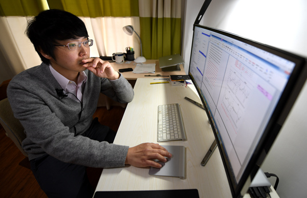 黃志偉在宿舍檢索學(xué)術(shù)資料。新華社記者 程敏 攝