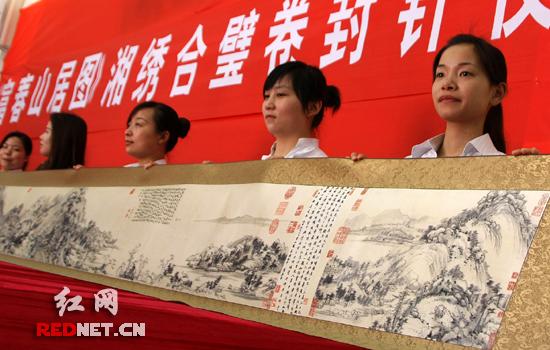 為此,湖南省沙坪湘繡博物館經(jīng)多方努力求得一幅《富春山居圖》合璧卷全圖復(fù)制件,由省資深文博專家原長沙市博物館副館長、湖南省沙坪湘繡博物館執(zhí)行館長魏明擔(dān)綱,湘繡藝術(shù)家羅國斌、黃歡愉等專家加盟成立繡研專家組,指導(dǎo)30多位刺繡大師,運用湘繡的針法與現(xiàn)代的先進(jìn)工藝進(jìn)行刺繡再創(chuàng)作,歷時五個月,精心繡出了與原作相同尺寸的極品湘繡合璧長卷。該長卷長達(dá)13米,已于今天上午在湖南省沙坪湘繡博物館封針。