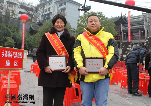 臺(tái)屬?gòu)埱帏P和楊春雷獲獎(jiǎng)合影。(圖片來(lái)源:鳳凰縣臺(tái)辦)