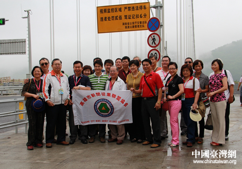 臺(tái)灣客人在吉首市矮寨特大懸索橋前合影。(圖片來(lái)源:吉首市臺(tái)辦)