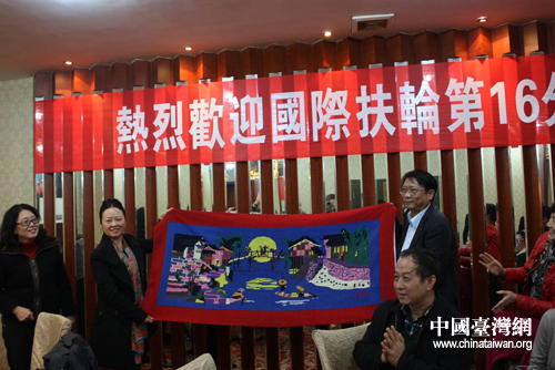 湘西州人民政府副州長向清平女士向臺灣嘉賓贈送土家織錦。(圖片來源:鳳凰縣臺辦)