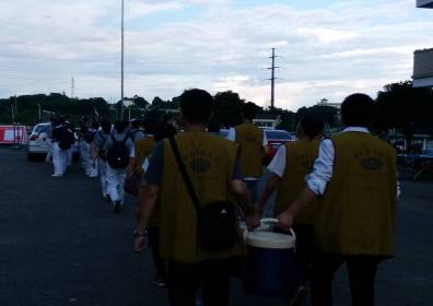 夜幕將下,志愿者們邁著堅(jiān)實(shí)的步伐,向?yàn)?zāi)民安置點(diǎn)行去。為了不增加安置點(diǎn)接待處負(fù)擔(dān),志愿者們自帶飲用水和實(shí)物。后圖中,志工們手中抬著的桶子,是他們自備的干糧和茶水。