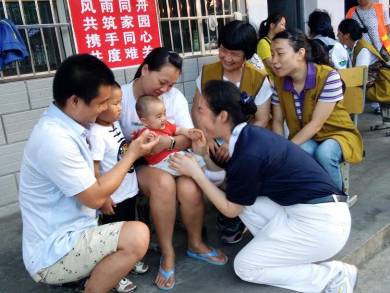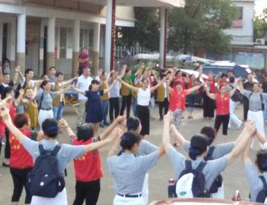 志愿者舉行心靈安撫活動(dòng),與受災(zāi)群眾手拉手一同合唱《我們是一家人》、《謝謝你們》。