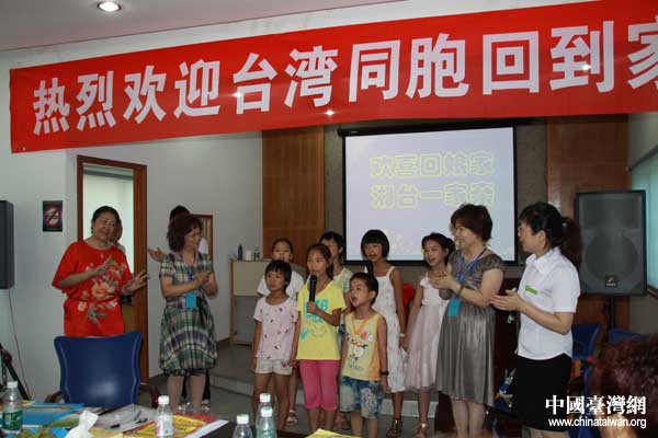 大陸配偶們在長沙市雨花區(qū)侯家塘廖家灣社區(qū)與當(dāng)?shù)鼐用窈椭驹刚呙鎸γ娼涣,圖為和社區(qū)小朋友一起共唱《姐妹》。(中國臺灣網(wǎng) 楊永青 攝)