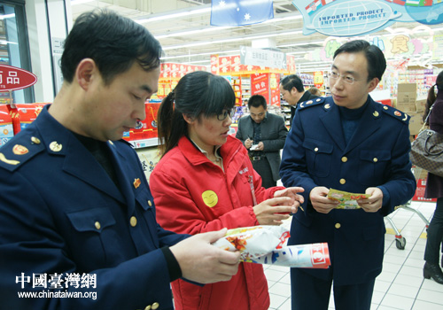 東臺工商局在東臺大潤發(fā)商業(yè)有限公司現(xiàn)場指導(dǎo)企業(yè)加強食品安全管理。(圖片來源:東臺市臺辦)