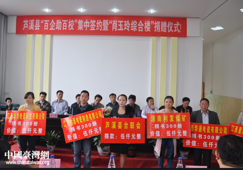 中國臺灣網(wǎng)11月5日蘆溪消息 日前,在蘆溪縣“百企助百!奔泻灱s暨“肖玉玲綜合樓”捐贈儀式上,蘆溪縣臺聯(lián)會慷慨解難為長豐鄉(xiāng)學校捐資5000元,用于改善學校辦學條件。(中國臺灣網(wǎng)蘆溪縣臺辦通訊員 童麗)