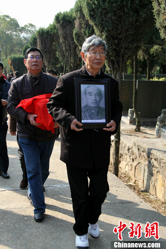 12月12日上午,江西南昌城郊的瓊山墓區(qū),78歲的杜及峰手捧父親的遺像,62歲的杜耀忠手捧父親的骨灰甕,攜杜家四代30多位后人,來到母親墓前。1949年至今,老兵杜俊卿與妻子謝鳳秀被那“一灣淺淺的海峽”隔絕了62年之久,今日合葬,兩位老人終于“團圓”。