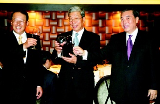 臺灣貿(mào)易協(xié)會昨晚宴請赴臺大陸采購團(tuán),臺灣方面熱情招待李水林(中)一行。(圖片來源:聯(lián)合報)