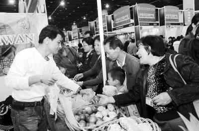 11月1日,120家臺灣農(nóng)林企業(yè),共212個(gè)展位,以臺灣農(nóng)林特產(chǎn)館集體亮相2009中國義烏國際森林產(chǎn)品博覽會。圖為臺灣水果展柜前購買水果的人群。張建成攝