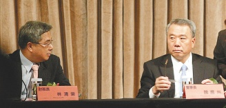 康師傅董事長魏應(yīng)州(右)和財務(wù)長林清棠(左)昨天專程返臺主持第三季法說會?春么箨懨髂甏箨懡(jīng)濟成長率,將側(cè)重飲料事業(yè)布局,并要在五年內(nèi)超越世界第一飲料品牌的可口可樂。