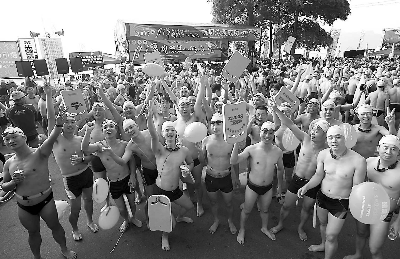 通過(guò)“小三通”航線(xiàn)首次參加日月潭國(guó)際萬(wàn)人泳渡活動(dòng)的福州冬泳隊(duì)員們,在開(kāi)幕式上當(dāng)聽(tīng)到主辦方主持人呼喚自己的隊(duì)伍時(shí),群起歡呼響應(yīng)。(資料圖片)
