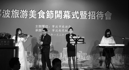 美食節(jié)開幕式上,南苑飯店餐飲部領(lǐng)班何麗思(右二)與臺灣同行的即興文藝表演贏得了甬臺兩地旅游界人士的陣陣掌聲。