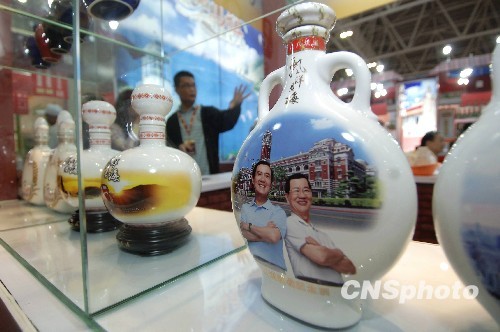 5月18日,貼有馬英九、蕭萬(wàn)長(zhǎng)肖像的臺(tái)灣白酒亮相第十二屆海交會(huì)。當(dāng)日,由國(guó)臺(tái)辦、中國(guó)貿(mào)促會(huì)、海關(guān)總署、國(guó)家質(zhì)檢總局和福建省政府共同主辦的第十二屆海峽兩岸經(jīng)貿(mào)交易會(huì)、第七屆中國(guó)福建商品交易會(huì)在新落成的福州海峽國(guó)際會(huì)展中心開(kāi)幕,近萬(wàn)名海內(nèi)外客商赴會(huì)。 中新社發(fā) 王東明 攝