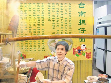 56歲在寶島夜市賣(mài)臺(tái)南擔(dān)仔面的陳國(guó)財(cái)說(shuō),他在臺(tái)南的擔(dān)仔面很早以前就收攤了,到北京是來(lái)開(kāi)創(chuàng)第二春,擔(dān)仔面一碗賣(mài)12元人民幣,試賣(mài)期間,一天都賣(mài)一百多碗。為了保持原汁原味,醬料都是臺(tái)灣運(yùn)來(lái)的,他相信“臺(tái)灣的口味”在北京一定會(huì)受歡迎。