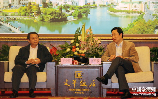 11月6日下午,南通市委常委、常務(wù)副市長(zhǎng)藍(lán)紹敏(右)會(huì)見了前來采訪的兩岸媒體“江蘇沿海行”記者。(中國臺(tái)灣網(wǎng) 王偉 攝)