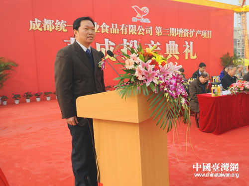 成都市臺辦副主任唐明建、溫江區(qū)委副書記王斌、成都統(tǒng)一企業(yè)食品有限公司總廠長林金龍分別在典禮上致辭。典禮結(jié)束后,與會嘉賓還一同參觀了已落成投產(chǎn)的成都統(tǒng)一企業(yè)食品有限公司第三期增資擴產(chǎn)項目生產(chǎn)線。