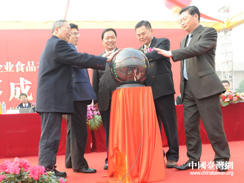 四川省臺辦副主任鐘遠超(右三)、成都市臺辦副主任唐明建(右一)、溫江區(qū)委副書記王斌(右四)、成都統(tǒng)一企業(yè)食品有限公司總監(jiān)劉子強(右二)、總廠長林金龍(右五)共同開啟標志成都統(tǒng)一企業(yè)食品有限公司第三期增資擴產(chǎn)項目正式落成投產(chǎn)的激光球。圖片來源:四川省臺辦