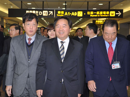 南京市長季建業(yè)(前中)率領(lǐng)經(jīng)貿(mào)考察團(tuán)15日搭機(jī)抵臺,隨行企業(yè)還包含蘇寧電器集團(tuán)、南京中央商場集團(tuán)等。 圖片來源:“中央社”