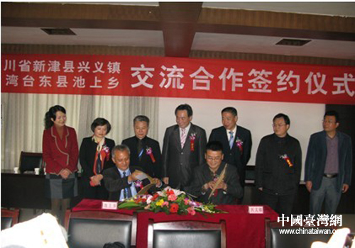 中國臺灣網(wǎng)12月4日成都新津消息 為了更好的加強(qiáng)海峽兩岸交流與合作,構(gòu)建惠及兩岸有機(jī)農(nóng)業(yè)產(chǎn)業(yè)發(fā)展的新平臺和新機(jī)制,日前,成都新津興義鎮(zhèn)與臺灣臺東縣池上鄉(xiāng)舉行了隆重的“締結(jié)交流合作鄉(xiāng)鎮(zhèn)”簽約儀式,雙方簽署了《兩岸鎮(zhèn)鄉(xiāng)交流合作協(xié)議書》。新津縣委常委、統(tǒng)戰(zhàn)部長黃蓉生,縣政府副縣長劉一陽、羅智敏,相關(guān)部門和鎮(zhèn)鄉(xiāng)負(fù)責(zé)人出席了簽約儀式。