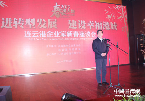 連云港市長楊省世在全市企業(yè)家迎新春聯(lián)誼會(huì)上致辭。(圖片來源:連云港市臺(tái)辦)