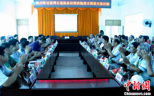 6月20日,臺(tái)灣花蓮縣參訪團(tuán)一行33人來(lái)到廣西來(lái)賓市鳳凰鎮(zhèn)龍旺村,考察大陸新農(nóng)村建設(shè),仔細(xì)詢問當(dāng)?shù)剞r(nóng)業(yè)發(fā)展情況,并與當(dāng)?shù)卮迕窦班l(xiāng)鎮(zhèn)干部進(jìn)行座談交流。中新社發(fā) 蒙鳴明 攝